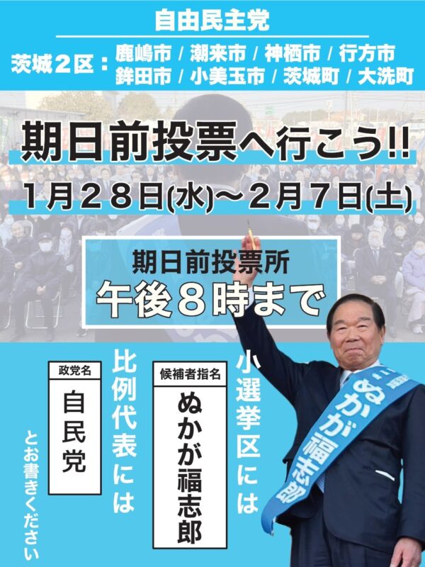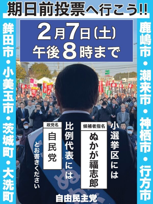 総選挙も8日目、終盤に入ります。 ぜひ期日前投票をご活用ください。 選挙区は「ぬかが福志郎」 比例代表は「自民党」 とお書きください。 皆さまからのご……