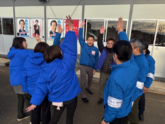 写真は遊説隊の朝の出発式です! 選挙戦もあと9日間、遊説隊と心を一つに選挙区各地をまわり、全力で訴えてまいります❗